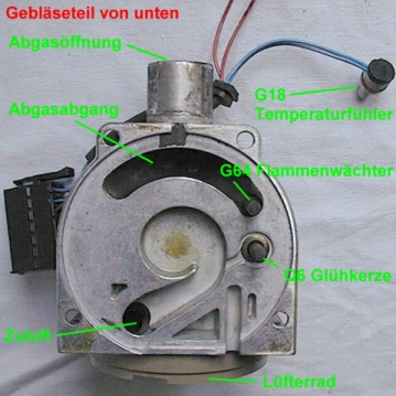 | * | Gebläseteil (Unten) | * | Wärmetauscher und Brenner (verdreckt) |